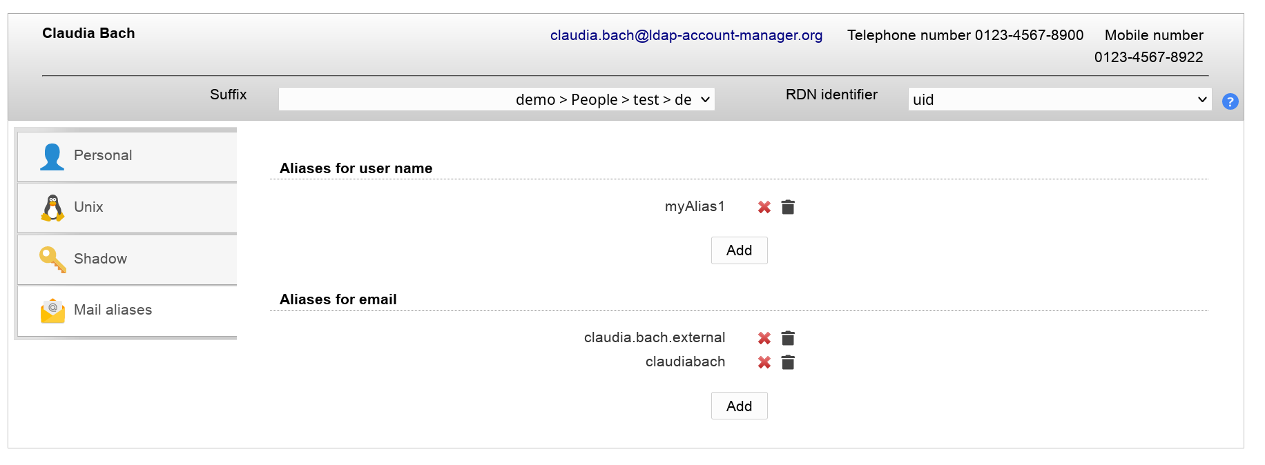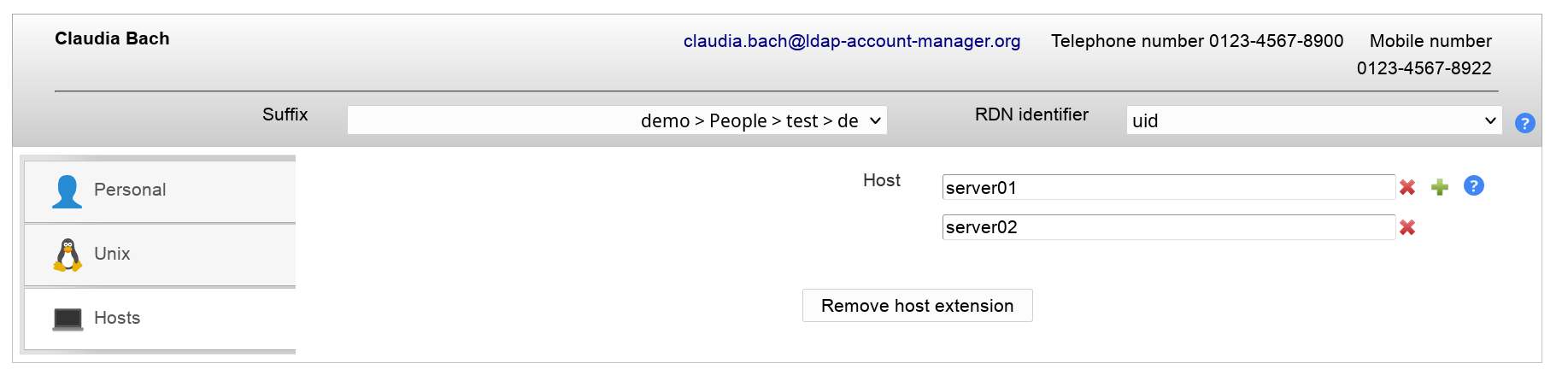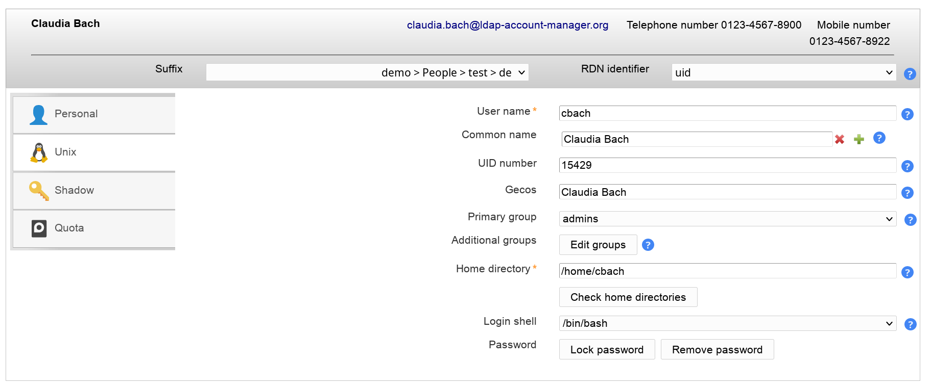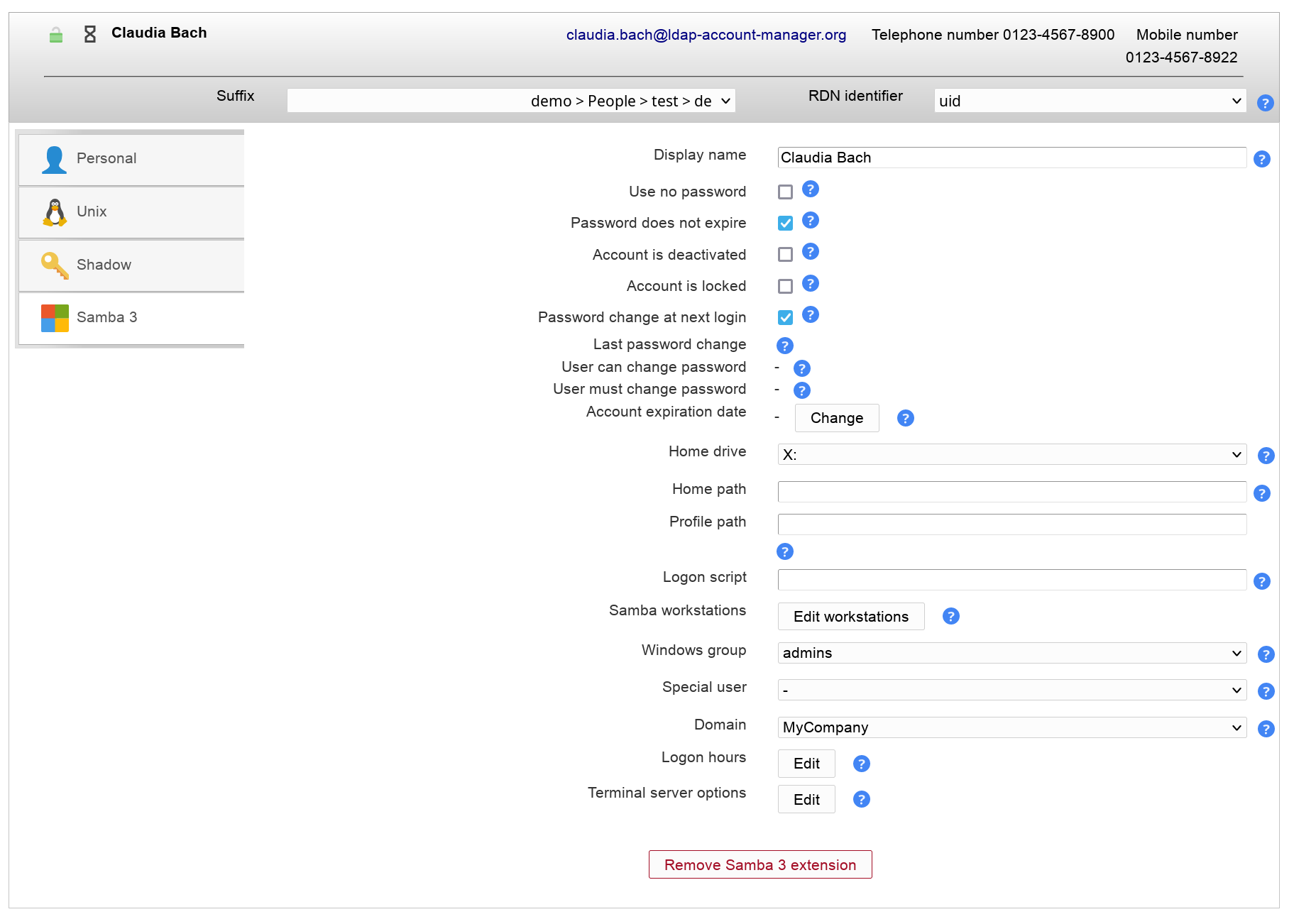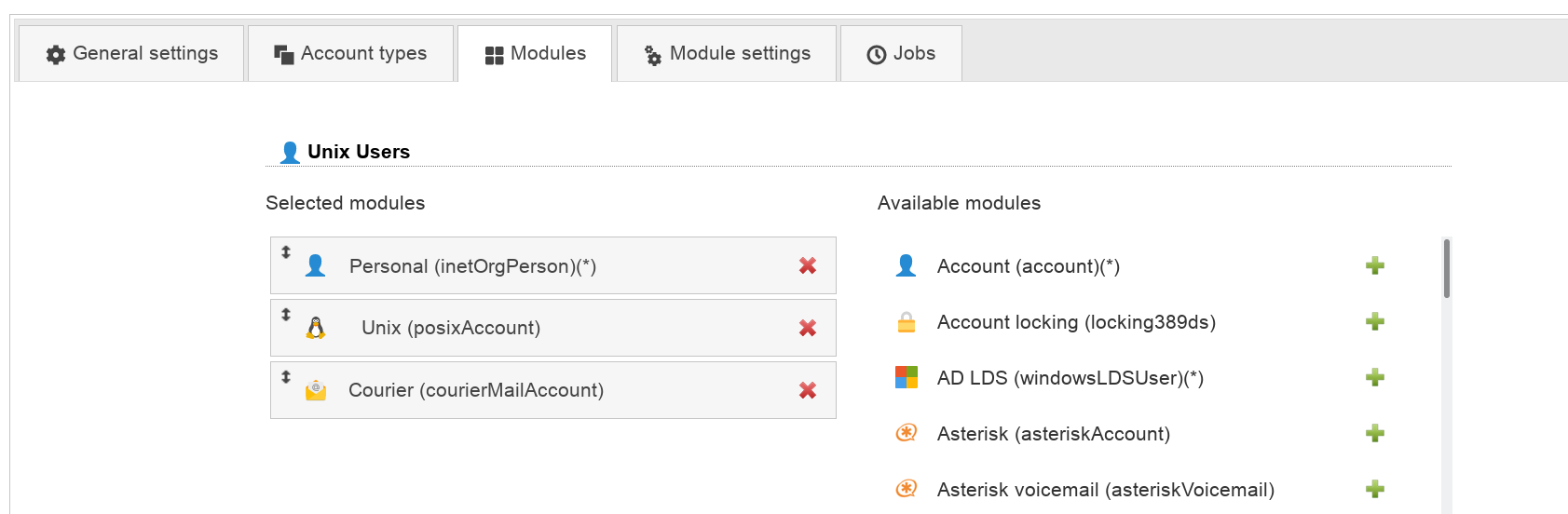 LAM manages various types of user accounts. This includes address book entries, Unix, Samba, Kopano and much more.