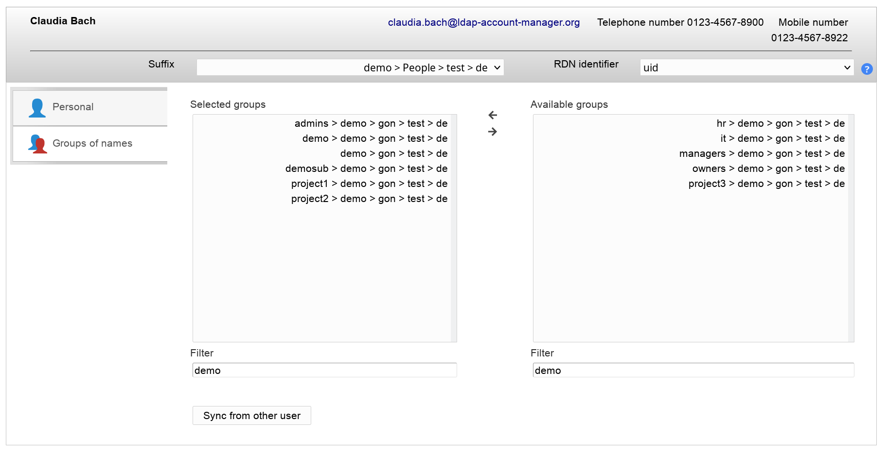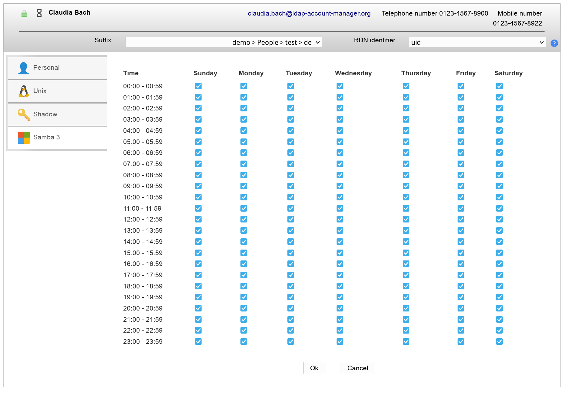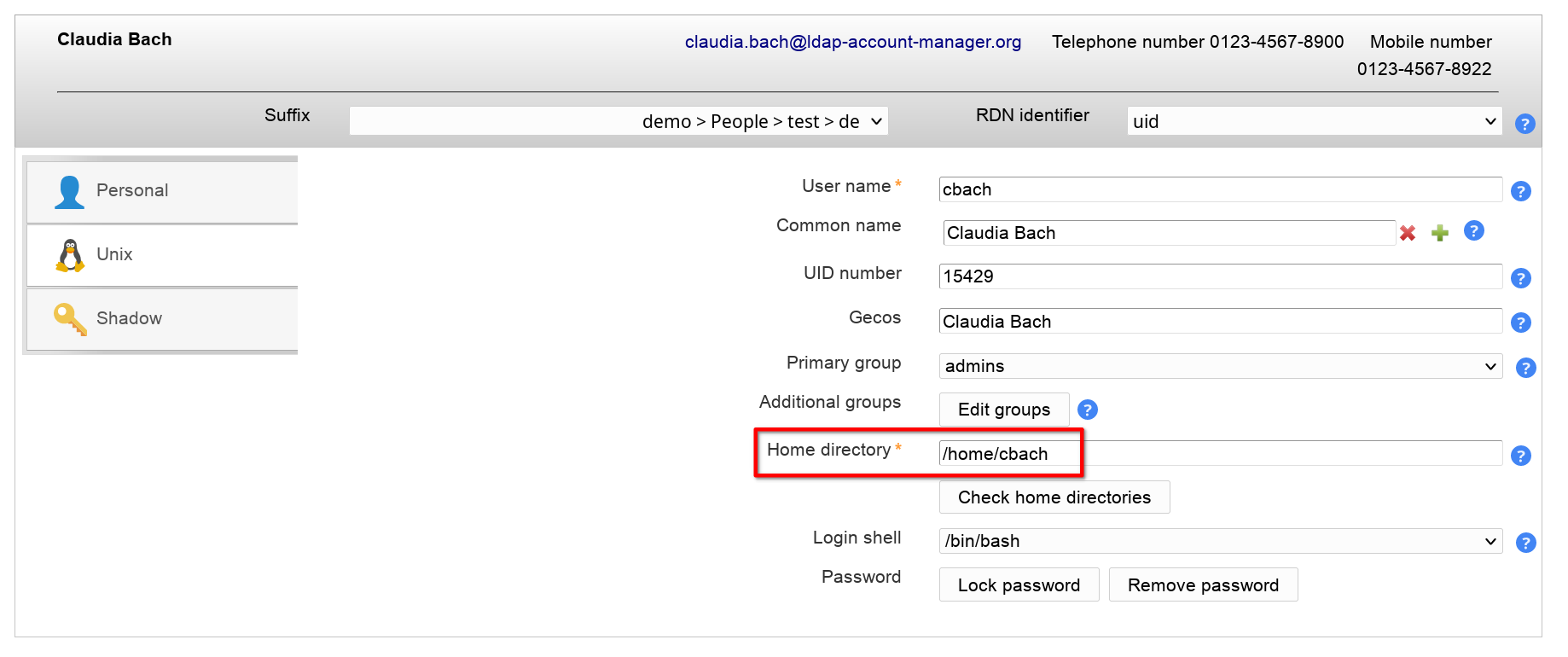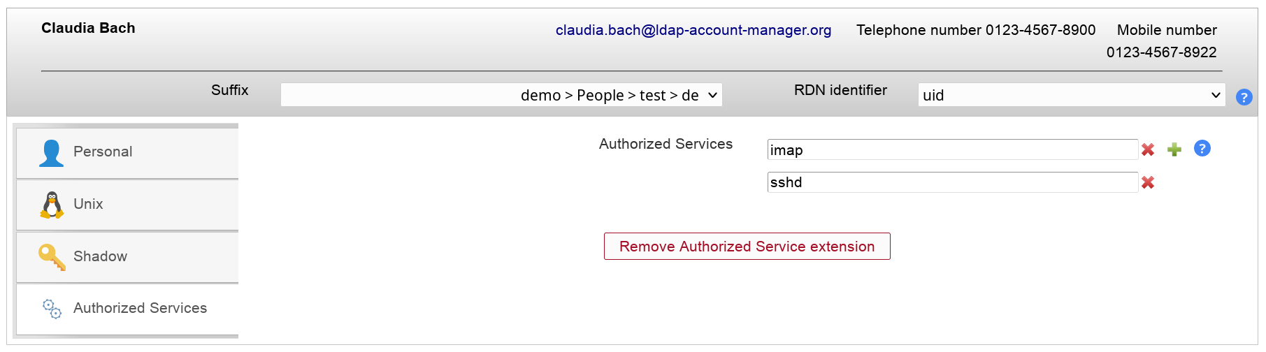 LAM manages various types of user accounts. This includes address book entries, Unix, Samba, Kopano and much more.