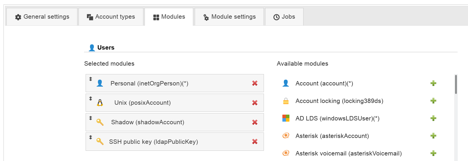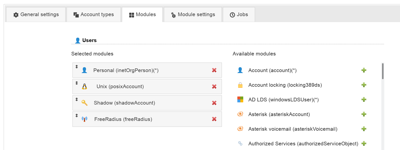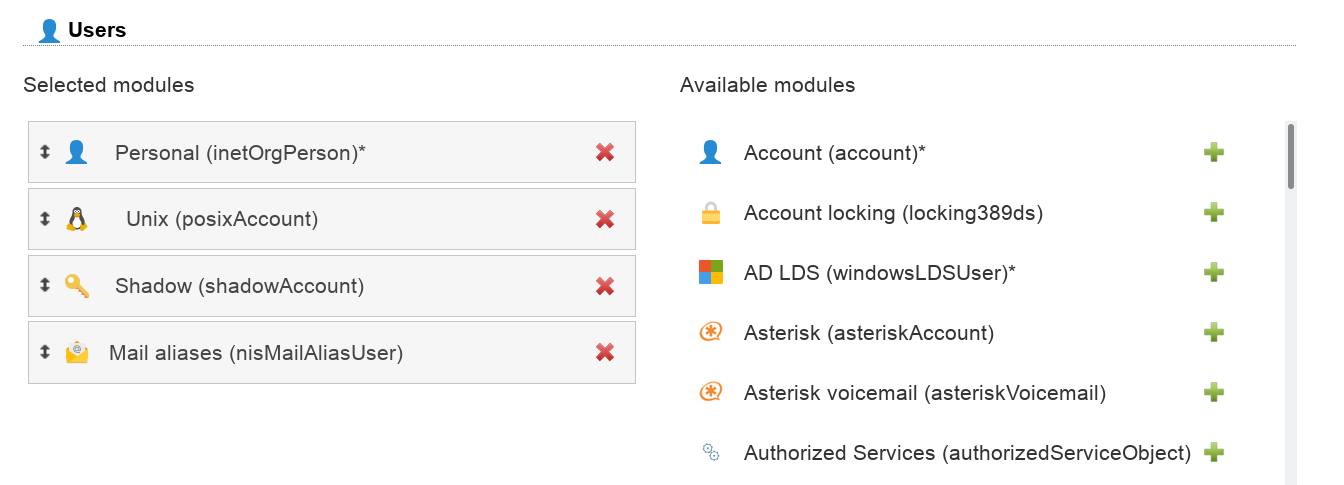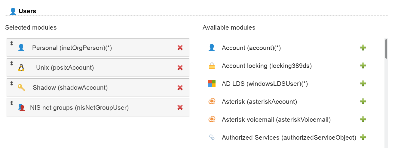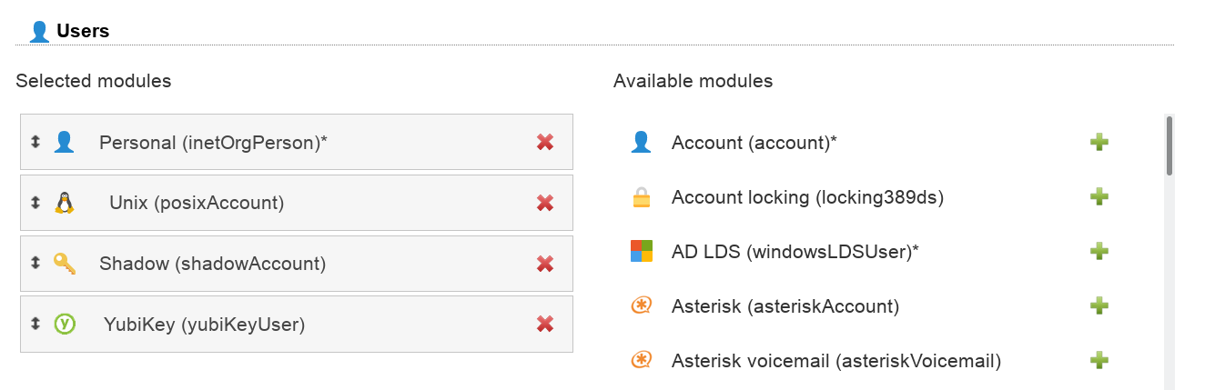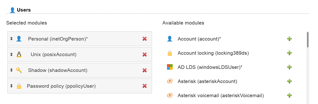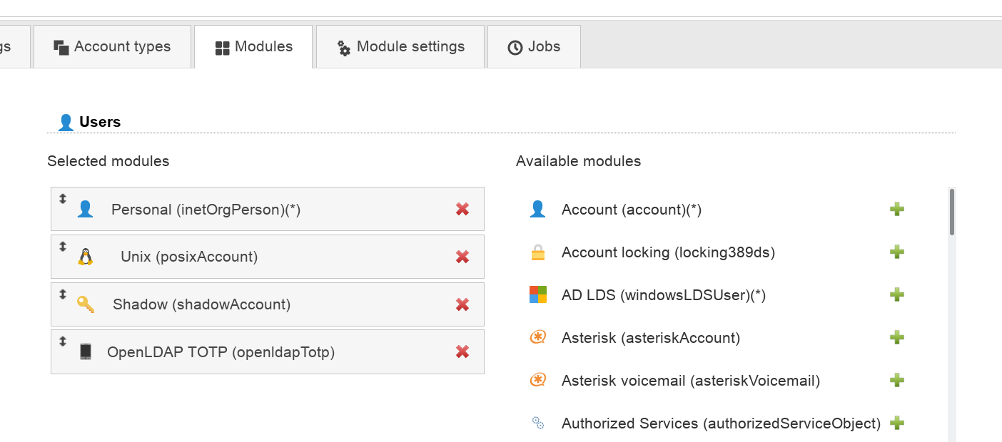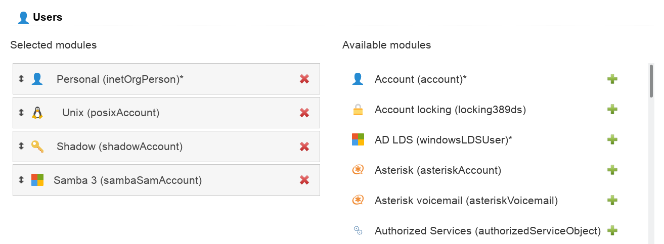 This is a very simple module to manage accounts based on the object class "account". Usually, this is used for host accounts only. Please pay attention that users based on the "account" object class cannot have contact information (e.g. telephone number) as with "inetOrgPerson".