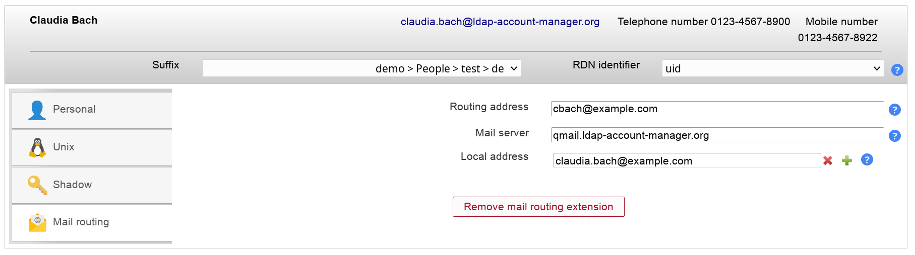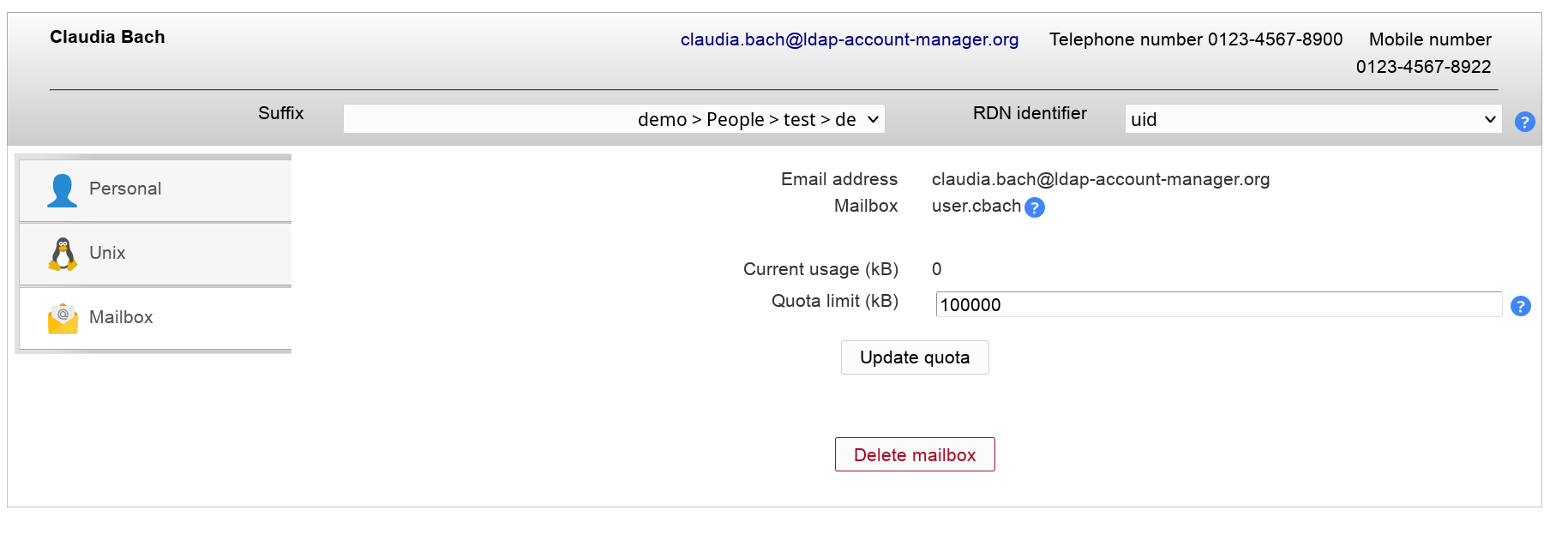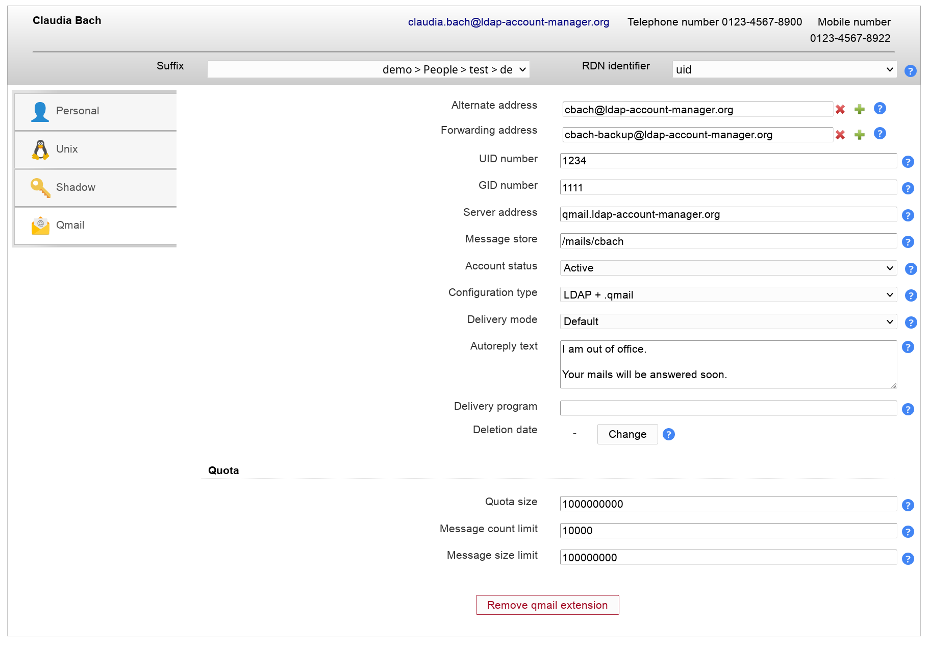 LAM Pro manages all qmail attributes for users. This includes mail addresses, ID numbers and quota settings.