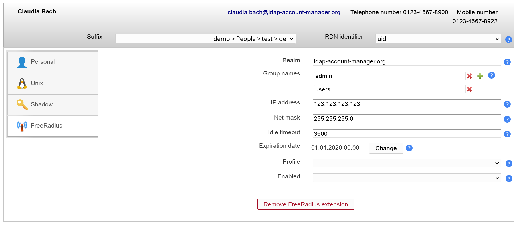 Now you will see the tab "FreeRadius" when editing users. The extension can be (de)activated for each user. You can setup e.g. realm, IP and expiration date.
