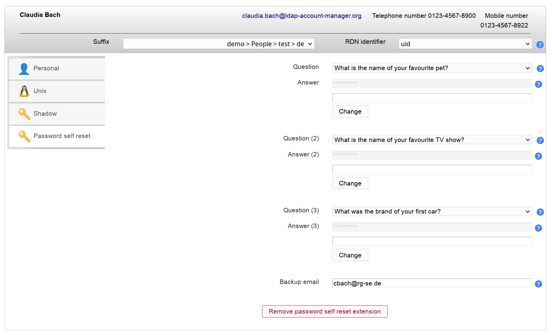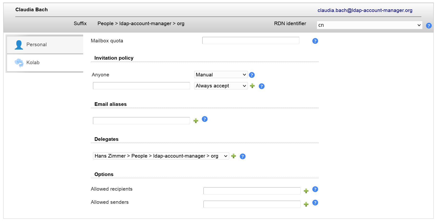 In advanced options you may also set fields to read-only (for existing accounts) and define limits for photo files. Additionally, you can add an "ou=addressbook" subentry to each user in case you manage user addressbooks.