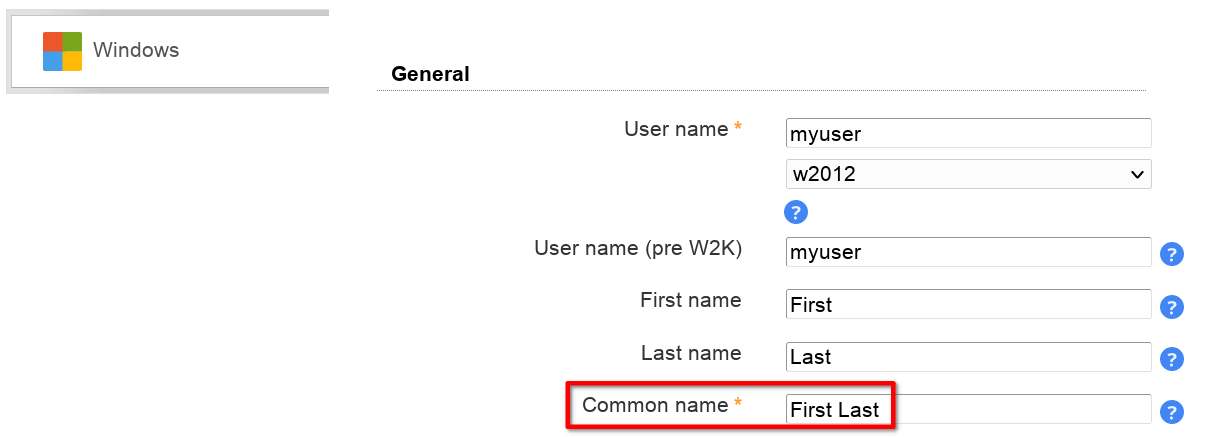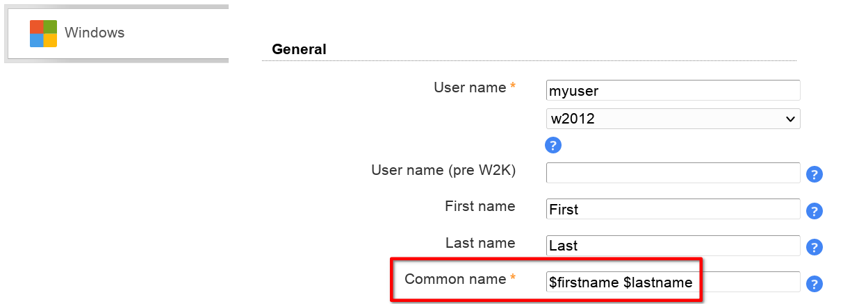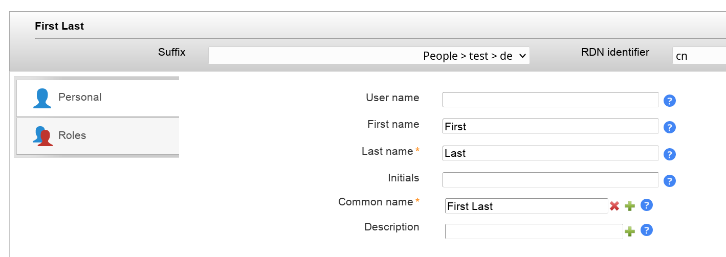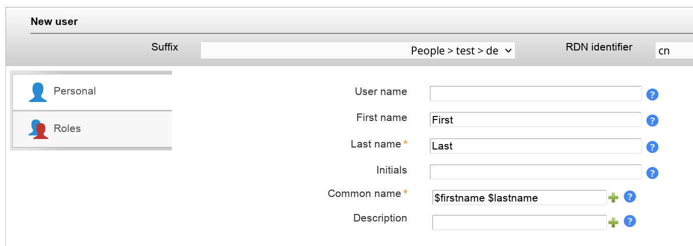User name suggestion: The user name is automatically filled as specified in the configuration (default smiller for Steve Miller). Of course, the suggested value can be changed any time. Common name is also filled with first/last name by default.