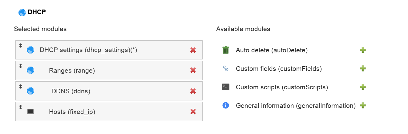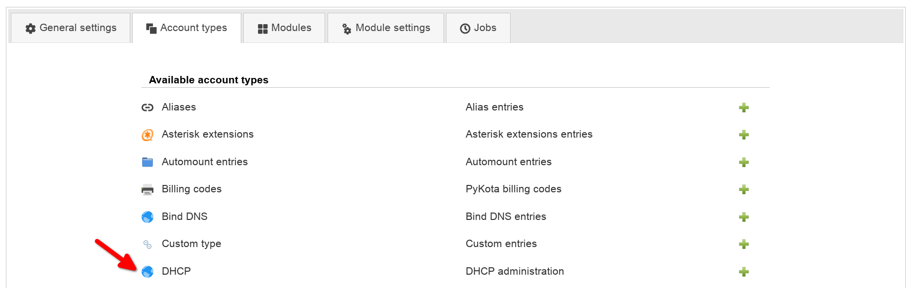 The DHCP management can be activated by adding the account type DHCP to your server profile. Please also add the DHCP modules.